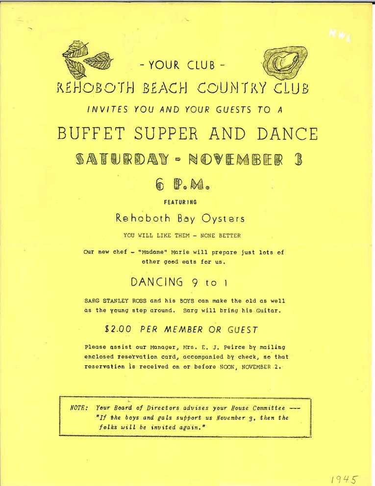 During 1945 a “Buffet Supper and Dance” evening was offered for $2 per Member and guest with reservations and payment due via mail, as shown below.