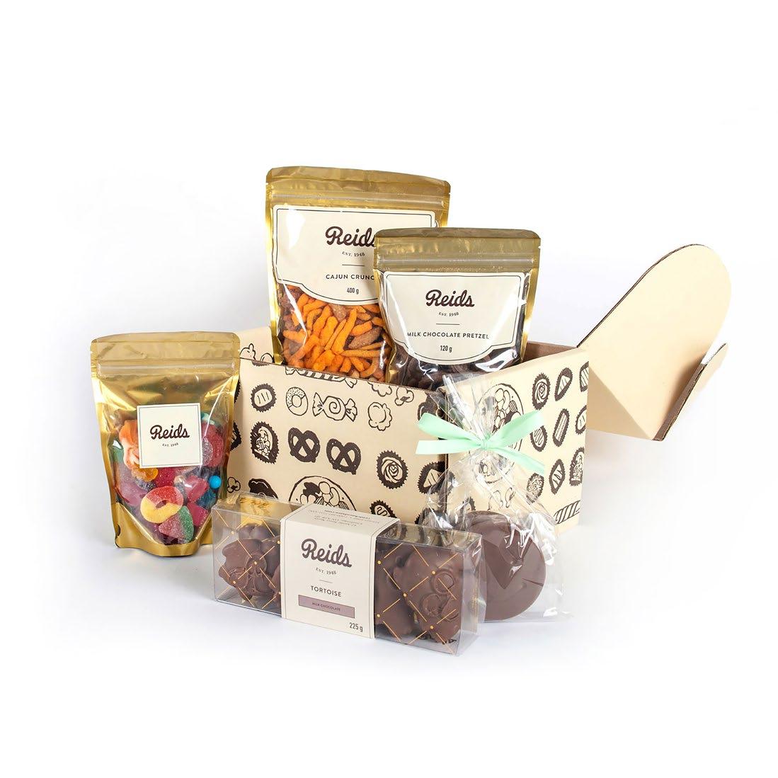 Over 4 lbs of Reids signature chocolates, sweet treats, and salty snacks, including 1/2 lb Tortoises, 1/2 lb assorted chocolates, 1/2 lb fancy mix nuts, 400 g Cajun Crunch, 200g Nut Crisp, 100g Rosebuds, 1/2 lb rocky road, and 1/2 lb candy mix.