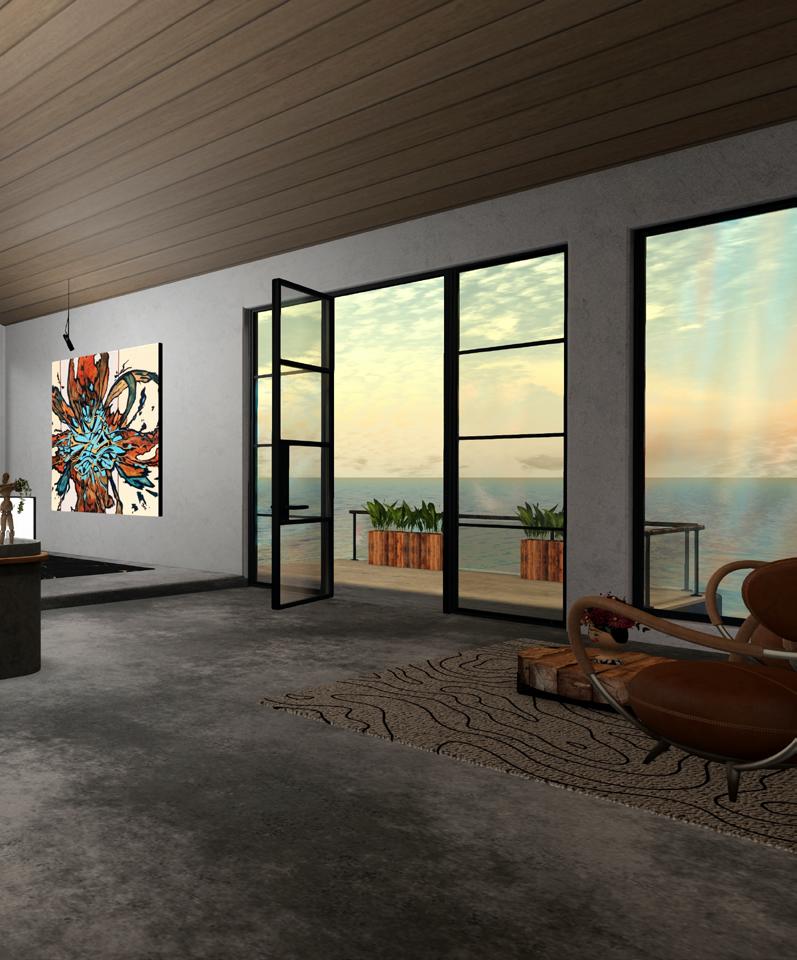 The solution was an open-flow design, a structure that feels alive even when still. A wraparound deck offers glimpses into three wings, creating a sense of curiosity and discovery. Inside, simplicity reigns — white walls, concrete floors — deliberate choices that ensure the artwork remains the focal point. The space does not demand attention; it holds it.