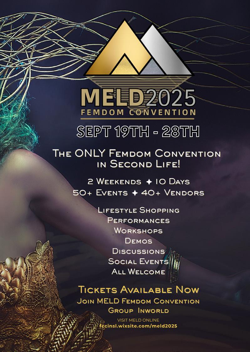 The MELD Femdom Convention, launched in 2023, rapidly established itself as Second Life’s leading celebration of D/s culture. Running from September 19–28, 2025, the convention features in-depth workshops led by experienced community members, immersive live performances, curated shopping opportunities, and social mixers— all within a strictly Femdom-positive environment. MELD distinguishes itself not only as an event but as a cultural milestone, welcoming individuals across all roles and orientations, and serving as the only dedicated kink convention in the virtual world.