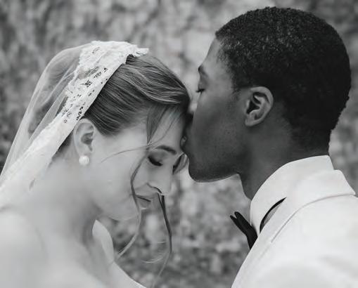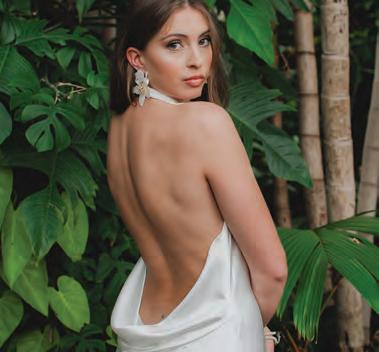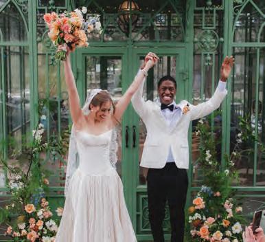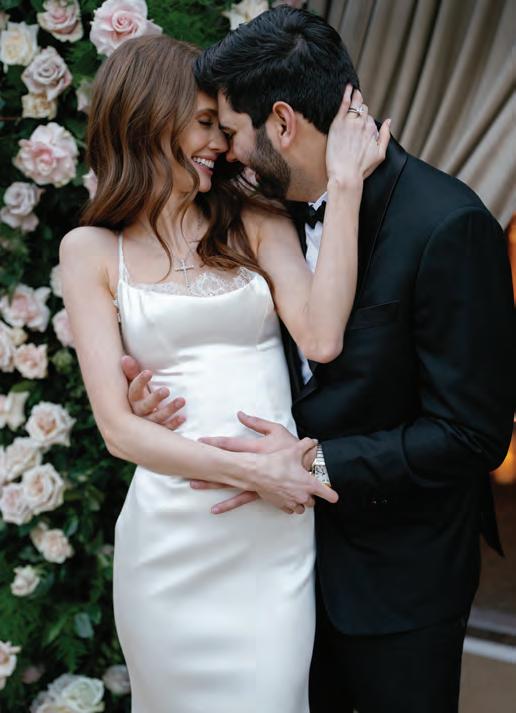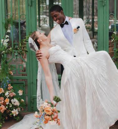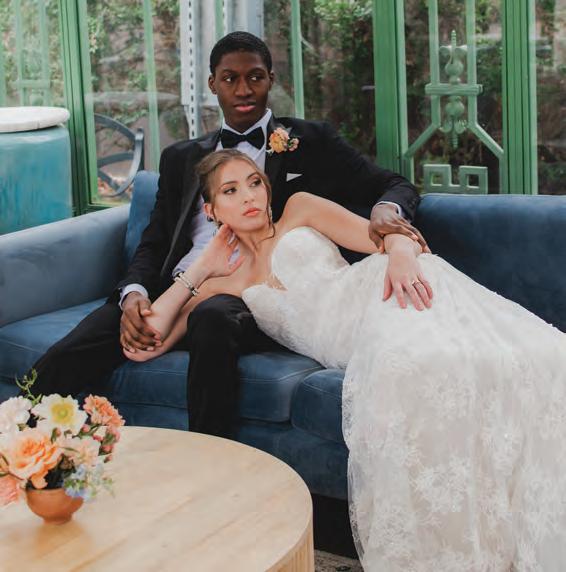 ON THE BRIDE: Katherine Tash “Bella” Gown, $3,960; Stylist’s Own Lele Sadoughi Earrings ON THE GROOM: State & Liberty “The Springer” Button Down, $105; Stretch Flat Front Tuxedo Pant, $180; “Stretch” Velvet Tuxedo Jacket in Black, $600