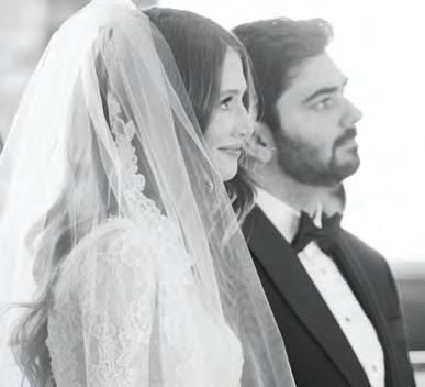 ON THE BRIDE: Guardiola “Valentina” Gown, $5,125; Stylist’s Own Oscar de la Renta Earrings ON THE GROOM: State & Liberty “The Springer” Button Down, $105; Stretch Flat Front Tuxedo Pant, $180; “Stretch” Tuxedo Jacket in Black, $600