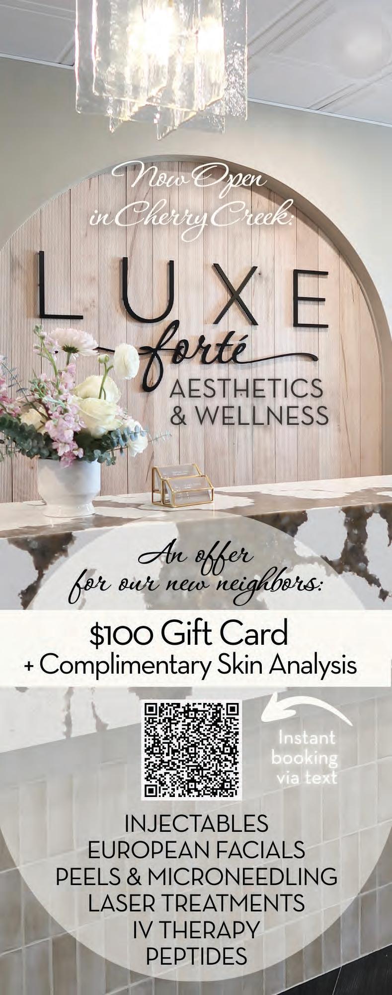 Marr & Company, LLC and its affiliates, employees, contributors, writers, editor (Publisher) accepts no responsibility for inaccuracies, errors or omissions with information and/or advertisements contained herein. The Publisher has neither investigated nor endorsed companies and/or products that advertise in the publication or that are mentioned editorially. The Publisher assumes no responsibly for the claims made by the Advertisers or the merits of their respective products or services advertised or promoted in Cherry Creek Magazine. Publisher neither expressly nor implicitly endorses such Advertiser product, services or claims. Publisher expressly assumes no liability for any damages whatsoever that may be suffered by any purchaser or user for any products or services advertised or mentioned editorially herein. Opinions expressed in the magazine and/or its advertisements do not necessarily reflect the opinions of the Publisher. CHERRY CREEK MAGAZINE Denver, Colorado 80206 303.917.6705 CHERRYCREEKMAG.COM