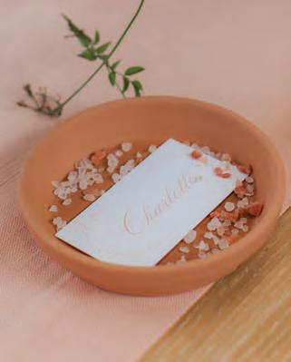 And then, the detail that made it all feel quietly brilliant: terracotta bread-and-butter plates that were repurposed plant saucers, topped with name cards dusted in pink Himalayan salt. “Personal, one-of-a-kind, and rooted in storytelling,” Jenna said.