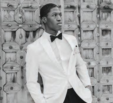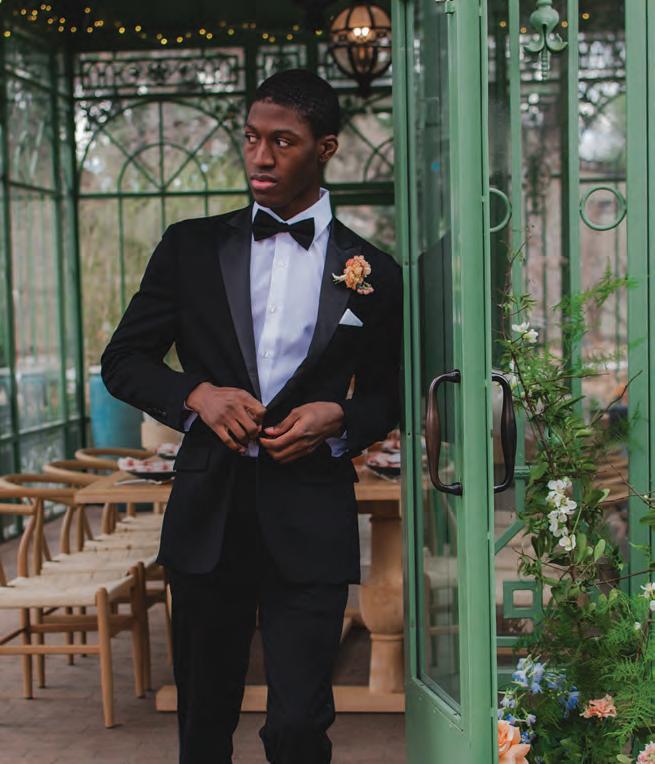 ON THE GROOM: State & Liberty “The Springer” Button Down, $105; Stretch Flat Front Tuxedo Pant, $180; “Stretch” Tuxedo Jacket in Cream, $600