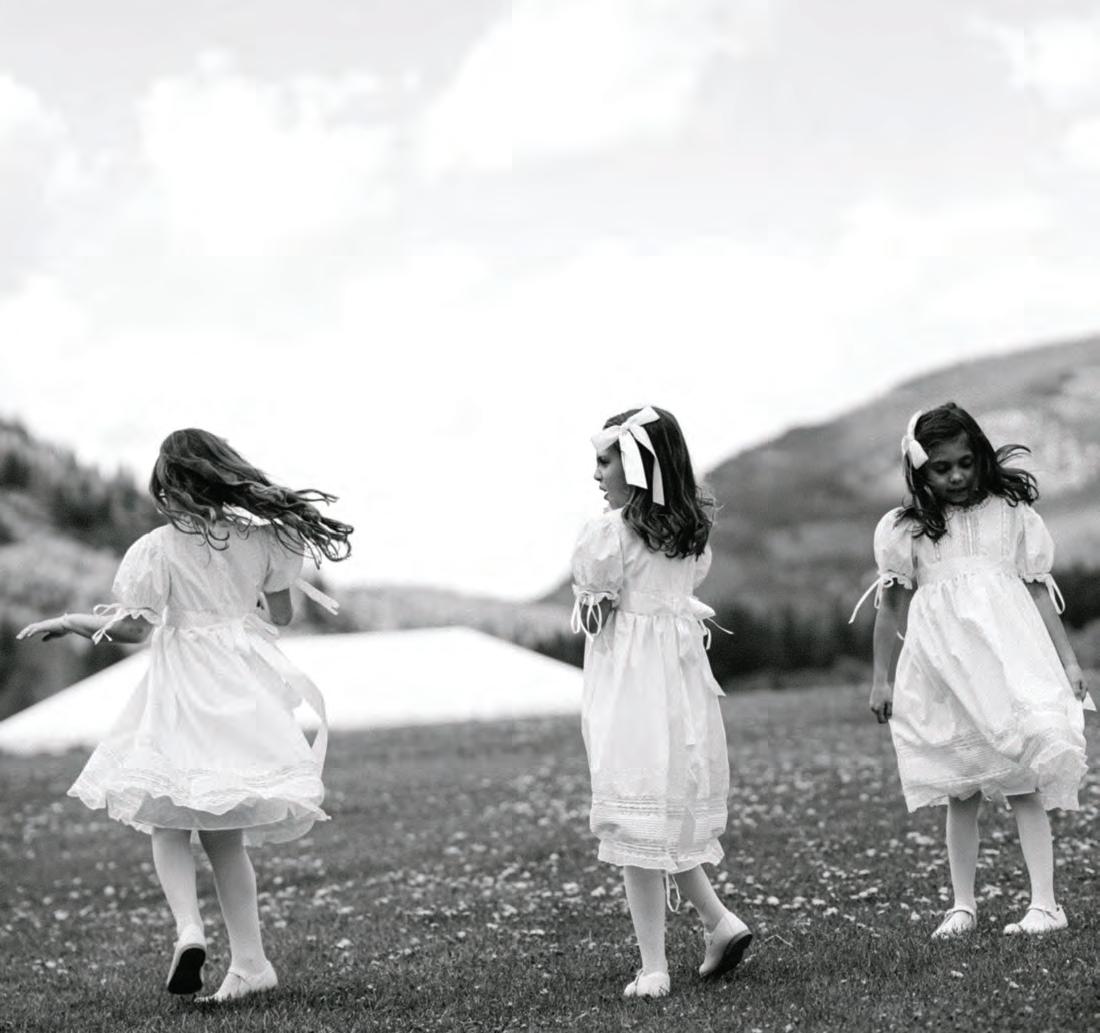 Three small figures, dressed like a storybook, spin and wander with the kind of innocence we spend the rest of our lives trying to remember. A flicker of Princess Diana bridesmaids energy, but wholly their own, in Vail.