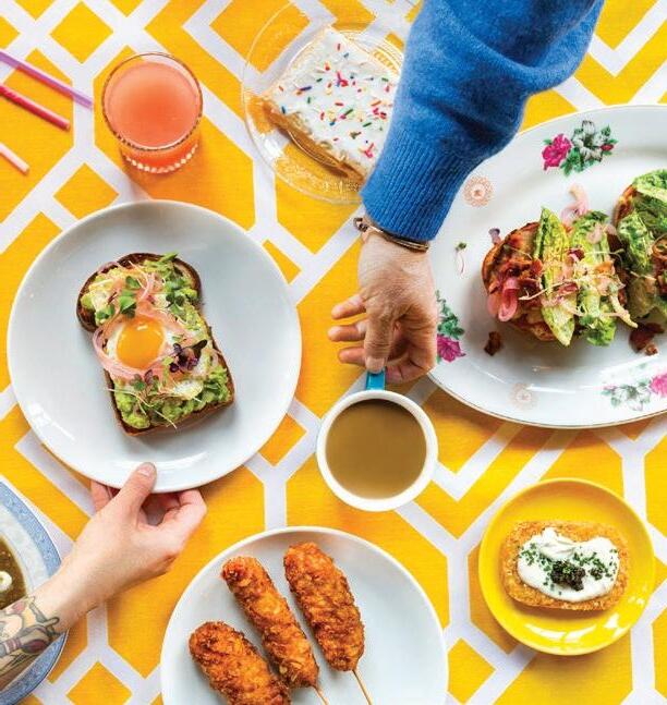 CLAYTON HOTEL & MEMBERS CLUB Burrata with apple mustard, braised fennel, and radish; a New York Strip Steak with sunchoke, pistachio, and caponata; Devil’s Food Cake with hazelnut praline crunch and peanut butter mousse; our Yo Soy Joaquin cocktail with Fresno-infused Don Julio Blanco, Orange Liqueur, Aperol, mango, and lime.