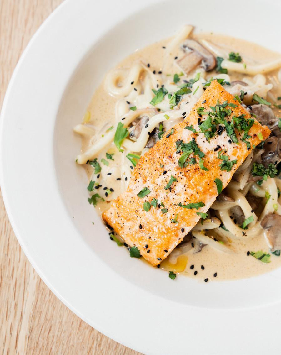 OLIVE & FINCH Executive Chef & Owner Mary Nguyen One dish I can’t wait for is the Pan Roasted Salmon, served with sweet corn puree, corn salad, arugula, cotija, toasted pepitas and a zesty schug sauce. Another highlight is our Garlic Roasted Half Chicken, paired with crispy sweet and red potatoes, roasted cabbage and a flavorful herbed pan sauce. If you’re in the mood for something with a bit of spice, our Dan Dan Noodles are a fantastic choice, featuring spicy minced pork, Sichuan peppercorn, mushrooms, kale, sesame paste, cucumbers, peanuts and scallions.