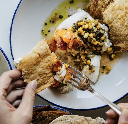 NARRATIVE AT THE JACQUARD Our cool burrata dish with garlic toast points and a citrus salad; pan seared halibut with champagne butter sauce; mixed berry Pavlova that creates warmth and texture with a sweet ending.