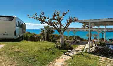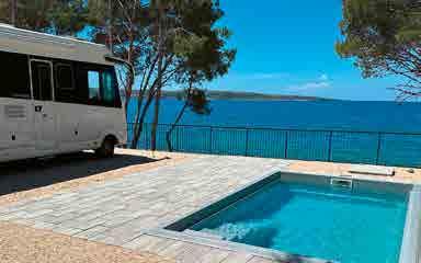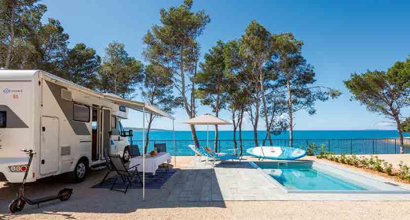 Das Aminess Avalona Camping Resort liegt idyllisch am grünen Kap im Süden der Insel Pag und verspricht ein ganz besonderes Urlaubserlebnis. Hier genießt man ein extravagantes Inselcamping mit bestem Service. Umgeben von unberührter Natur kann man nur einen Steinwurf von der türkisen Adria entfernt stehen. Das Besondere sind die privaten Pools, an denen man direkt mit dem Mobil stehen kann – einzigartig in Kroatien. Es gibt mehrere Restaurants und Bars, eine Konditorei, eine Bäckerei und ein Shop. Natürlich bietet das Avalona Spa Centre Wellness auf höchstem Niveau, mit Thalasso-Elementen, ätherischen Ölen und einheimischen Pflanzen.