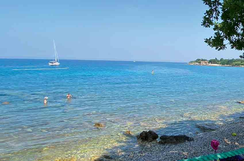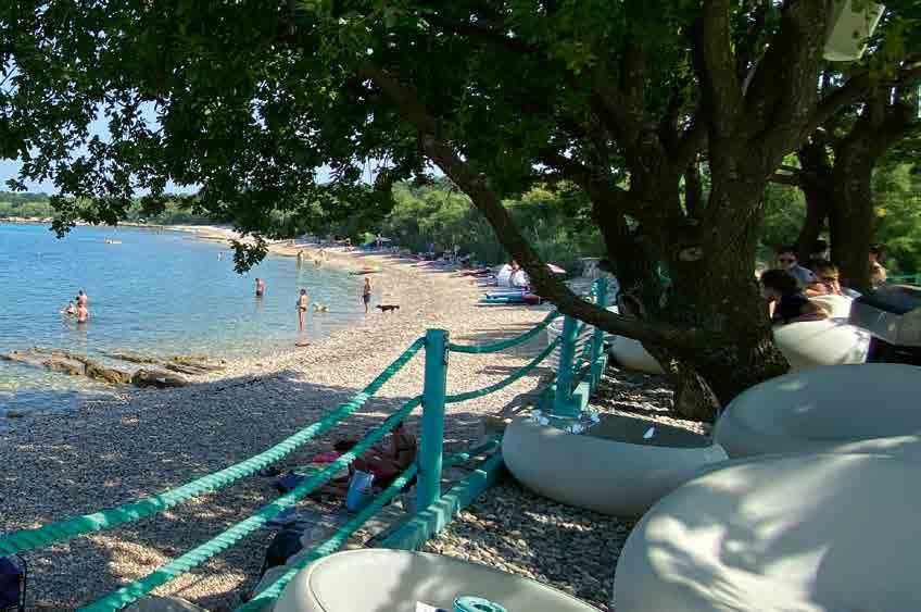 Der 800 m lange Kiesstrand bietet natürlichen Schatten und kristallklares Wasser. Er ist in vier Zonen unterteilt: Glamping, Relax, Family & Relax und Pet-Friendly.