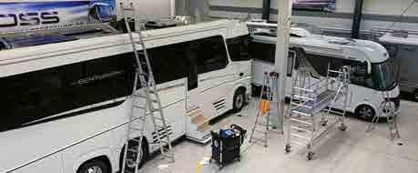 Wer über viele Jahrzehnte Erfolg haben möchte, muss aber nicht nur gut beraten können, sondern auch im AfterSales gut aufgestellt sein. So stehen acht Serviceplätze und ein eingespieltes Team für Wartungsarbeiten, Ausbauten, Umbauten, Modernisierungen oder trendige Folierungen zur Verfügung. Im Karosserie-Zentrum, können Schäden –bis hin zum Austausch von Seitenwänden oder Frontmasken behoben werden. Natürlich kann man hier die Fahrzeuge auch mit einem optischen oder technischen Update modernisieren und autark machen. Und die Besonderheit: mit der eigenen Möbelschreinerei, können individuelle Sonderwünsche erfüllt werden, so wird nicht nur der Wohlfühlfaktor, sondern auch der Wert des Fahrzeuges erhöht.