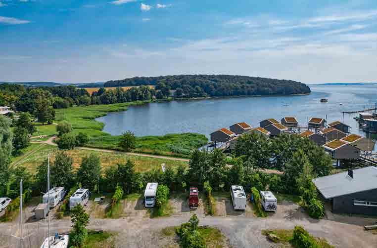 Der Reisemobil-Hafen hat 20 Wohnmobilstellplätze mit grünen Abtrennungen zum Nachbarn. Im Restaurant Kormoran gibt es fangfrischen Fisch mit herrlichem Blick aufs Meer. In der Nähe gibt es viele weitere Segler-Kneipen, Cafés und Restaurants. Und natürlich die Möglichkeit am großen Angebot von Wassersportaktivitäten, teilzunehmen. Chipkarten für Strom, die Duschen, die Waschmaschinen oder Trockner sind am Kiosk erhältlich. Eine kostenlose Abwasserentsorgung befindet sich zwischen den beiden Servicehallen. Es gibt einen Spielplatz für die Kleinen, neue Grillstellen für gemütliche Abende und das Hafenbistro mit praktischem Brötchen-Service. Ob romantische Auszeit zu zweit oder ein aktiver Familienurlaub – hier wird jeder Aufenthalt unvergesslich.