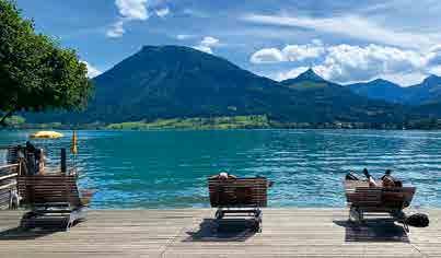 liegen. Der Wolfgangsee ist ein beliebter Ort für Wassersportler und bietet Möglichkeiten zum Segeln, Paddeln und Schwimmen – stets mit dem beeindruckenden Panorama der Berge im Hintergrund. Besonders zauberhaft wird die Atmosphäre in den Abendstunden, wenn die Lichter des Dorfes über das Wasser glitzern und eine magische Stimmung verbreiten. Rund um St. Wolfgang befinden sich zahlreiche Wanderwege, die sowohl zu sanften Spaziergängen als auch zu anspruchsvolleren Bergtouren einladen. Die nahe gelegene Schafbergbahn, eine nostalgische Zahnradbahn, bringt Besucher hinauf auf den Gipfel des Schafbergs, von wo aus sich ein atemberaubender Blick über den Wolfgangsee und die umliegenden Seen eröffnet. Nach unserem Bummel geht es zum Übernachten zur Berau – einem schönen Camping, der ein paar große Plätze direkt am See hat. Auf der Terrasse des Restaurant Schmankerlstubn lassen wir den Tag mit einem Sundowner ausklingen.