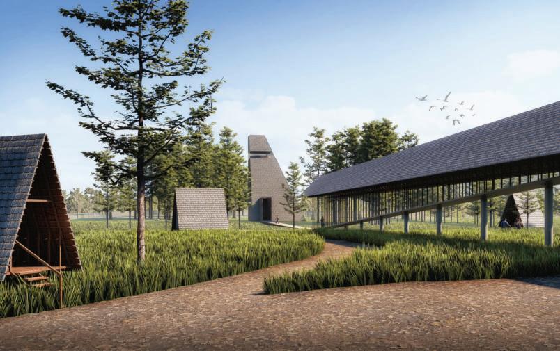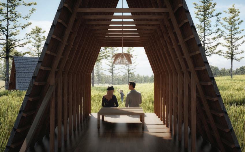 The ecotourism center has an intention to explore and train the potential of the com munity other than in the agrarian field. Expressions and creations in the field of art can be accommodated through exhibi tion space. The Hall accommodates vari ous workshop activities. Pavillions is a place to stop and enjoy the whole rice fields scenery. An architectural experience is presented in the form of a pathway with prominent tectonics while enjoying the journey to Periscope Tower. Visitors can enjoy the view of the Teak Forest from a bird's eye perspective from Periscope Tower. Visitors can get around the site by bicycle.