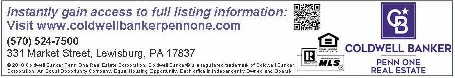 See it all! www.therealestatejournal.comREJ 7Call 866-978-1792 enter number on photo! Instantly gain access to full listing information: Visit www.coldwellbankerpennone.com/rej.html (570) 524-7500 331 Market Street, Lewisburg, PA 17837 ® 2010 Coldwell Banker Penn One Real Estate Corporation. Coldwell Banker® is a registered trademark of Coldwell Banker Corporation. An Equal Opportunity Company. Equal Housing Opportunity. Each office is Independently Owned and Operated.
