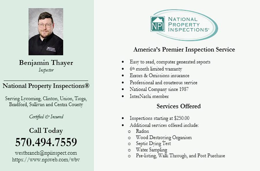 HISTORICAL BUILDING IN THE HEART OF SMETHPORT, PA!!! Lots of potential for this building with 2 office spaces or rental areas for a small business, birthday parties, etc. located ground level. One apartment on the second floor ready to be rented with potential to finish off another are on the second floor for a second apartment. M MLS#31713287...$245,000 www.therealestatejournal.com/104062 NEW LUXURY HOME OR VENUE!!! This spacious, beautiful and unique home is situated on 126.34 acres at the top of the hill overlooking Wellsboro. It features central air and vac systems, generator, expansive rooms, cherry hardwood & ceramic tile flooring, recessed lighting, vaulted ceilings, & an abundance of floor to ceiling windows that allow natural light to illuminate all the rooms. With a vast great room & loft, 5 Bedrooms, 6 Bathrooms, and a beautifully detailed basement apartment. M MLS#31713400...$1,750,000 www.therealestatejournal.com/104588 THIS PROPERTY HAS APPROXIMATELY 425' OF PINE CREEK FRONTAGE!!! The 2000 sq ft Red Shed Bldg is a great business location. There are also several smaller bldgs as well used for "Flea marketing" with 150' of Rt 6 road frontage. The asking price is for Land/Buildings and contents! It is a total of 4.47 acres of prime property. Approx. 3 acres of open level ground and 1.47 acres of wooded land adjacent to Pine Creek. M MLS#31713275...$465,000 www.therealestatejournal.com/104004 THIS LAND IS PICTURESQUE!!! There is a stream on the property. There is a large portion of this that is wooded. The Seller is having it Subdivided and it will be completed before settlement. M MLS#31713260...$399,000 www.therealestatejournal.com/103890 OPPORTUNITY OF A LIFETIME!!! Whites Corner Automotive Garage is a great property for an investor or anyone who has dreamed of owning their own business. This well established local business is highly profitable and comes with a book of existing clientele. Fully equipped with two auto repair bays including 2 separate lifts, full size automotive paint booth, sand blasting station, tire balancer, parts wash station, leaf break machine, 20 ton press, plus much more. M MLS#31713017...$299,757 (2.53 Acres) MLS#31715514...$334,757 (11.00 Acres) www.therealestatejournal.com/102571 A PERFECT LOCATION!! A Doctor, Dentist, Chiropractor, Counselor, Lawyer...the list is practically endless. Just about any professional occupation would work perfectly in this great location, with plenty of private off street parking. A large waiting room, spacious reception area, with 4 spacious offices/patient rooms with sinks and mechanicals. Business and equipment can also be purchased for an additional agreed upon fee. M MLS#31713044...$187,500 www.therealestatejournal.com/102772 GREAT BUSINESS OPPORTUNITY!! Large garage space with office/reception area overlooking Mansfield. 50 X 80 garage/shop area with 12 X 50 office space. Are you looking to follow your dream of autobody work as a business or growing out of your current space look no further. Paint booth, 2 post auto lift, air compressor with all the plumbing to have air through out the shop. MLS#31712678...$359,000 www.therealestatejournal.com/660156 OIL, GAS AND MINERAL SUBSURFACE RIGHTS ONLY Surface rights were previously sold to a bordering neighbor. Most recent lease has expired and property is available to re-lease again. Seller is selling the subsurface OIL, GAS AND MINERAL RIGHTS ONLY. NO surface rights included. Copy of Deed is on file and available upon request. MLS#31712601...$29,900 www.therealestatejournal.com/659075