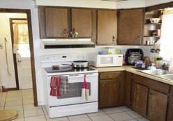 pocket door, open stairway, eating area off kitchen overlooks the landscaped lot & garage.