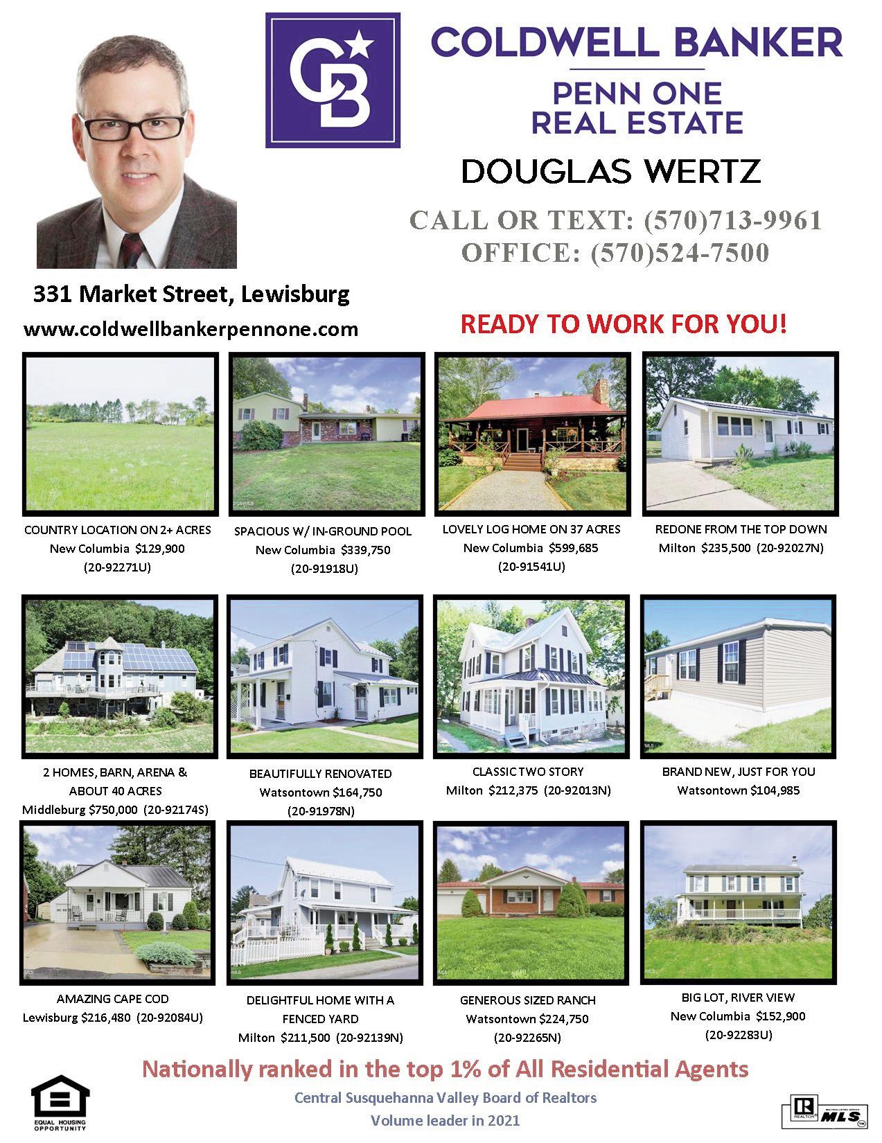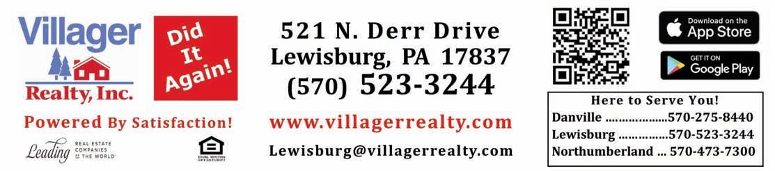 See it all! www.therealestatejournal.comREJ 5Call 866-978-1792 enter number on photo! ThinkingofSelling?CallAVillagerAgentToday! JIM HOLTZAPPLE 570-490-4663 SABRA L KARR 570-428-5765 TERRY MCLAUGHLIN 570-490-1002 RENEE VONADA 570-490-1340 RAYMOND BEACHY 570-713-5910 KELLY SEIGEL 570-713-8503 ANDY ANDERSON 267-716-4506 TERRY CONRAD 570-428-3160 TAMMY STAMM 570-412-9223 BEATRIZ BENEDIT 570-768-8801 DUANE SWEIGARD 570-238-5007 TWO-STORY HOME IN MIFFLINBURG NEW PRICE! On this Nice 3BR, 1BA home with newer 2 car garage. This home has oil hot water heat with 2 mini spit heat pumps. Large kitchen/dining room combo. Nice porch in front and covered patio in rear. New replacement windows. Also new electrical 100 amp panel. Bedroom #3 has plumbing that could be converted back to bathroom. $155,000 mls#20-92153 NICE HOME IN WINFIELD Spacious Two story with 2,900 square feet of living space. 4 Bedrooms, 2.5 baths, fireplace, sunroom, family room, heat pump, central air, landscaped one acre lot in Gilead Estates. A lot of it is wooded. $415,000