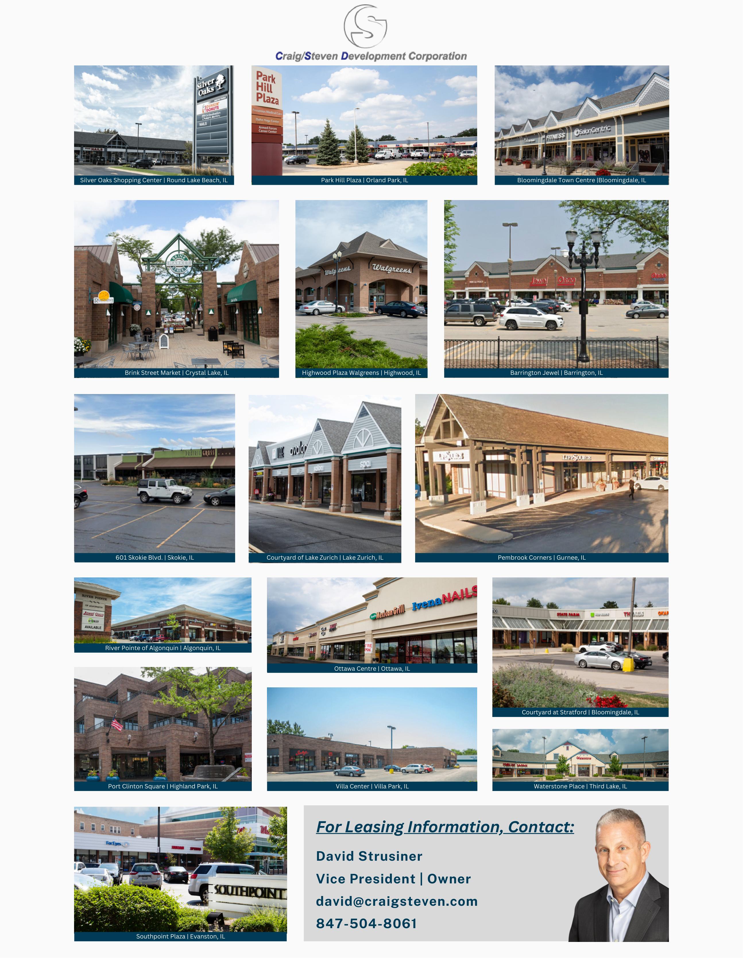 Anchor Tenants: Walgreens, Lou Malnati Pizzeria, Avalon Spa Rental Rate: $20.00