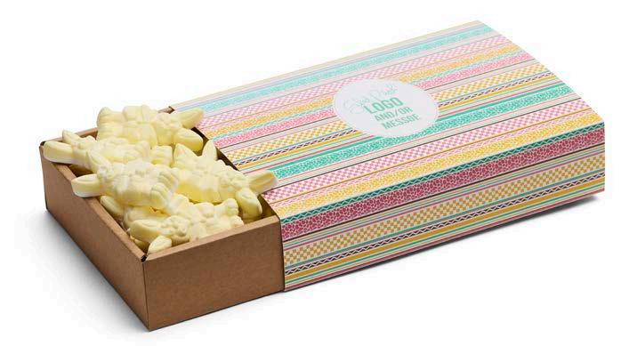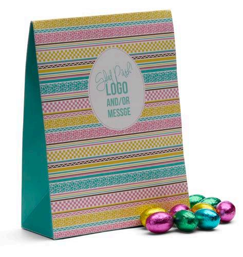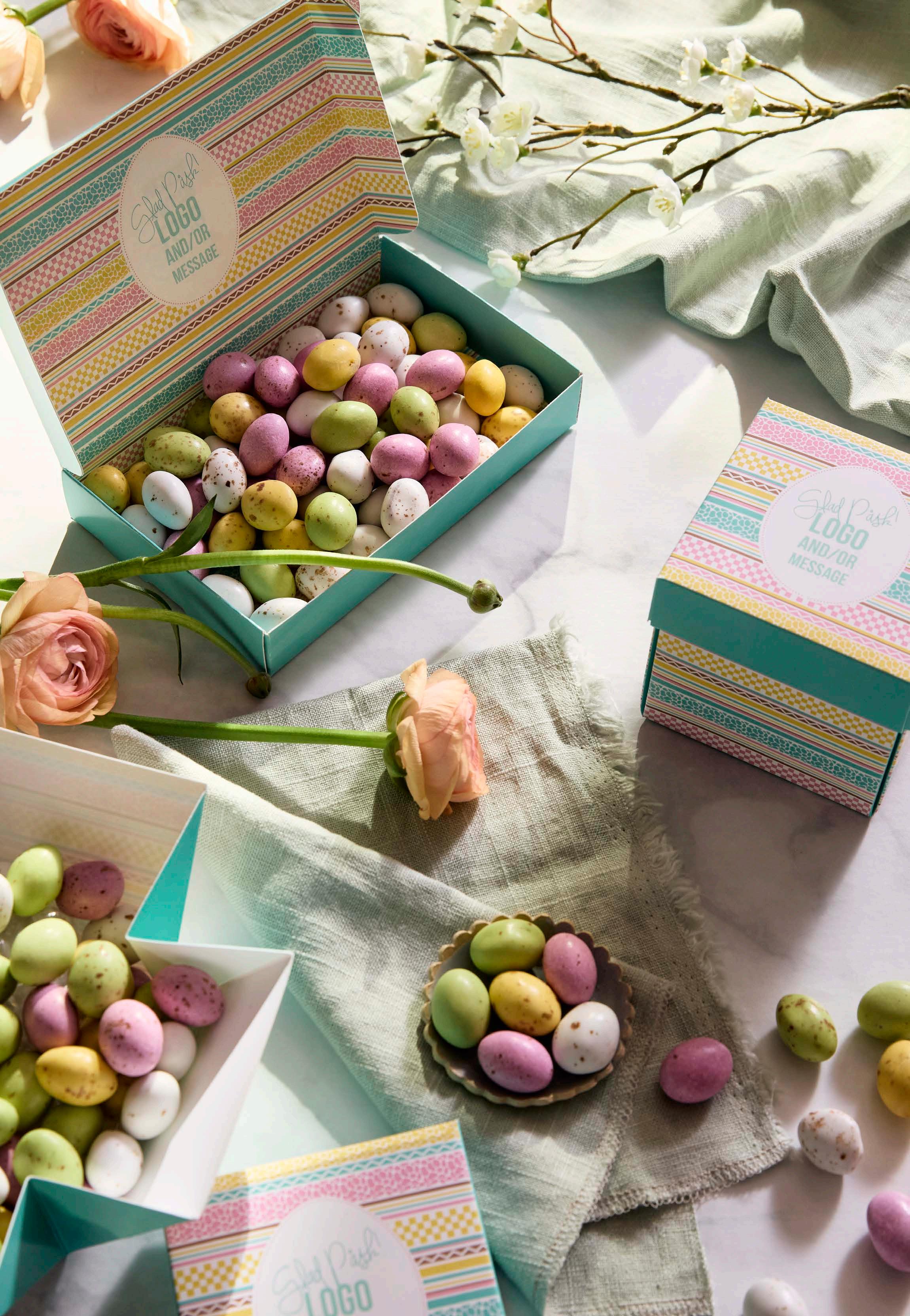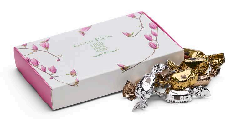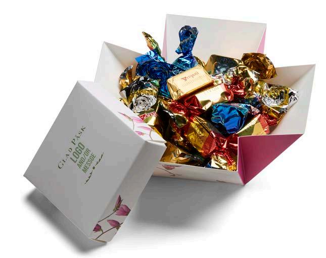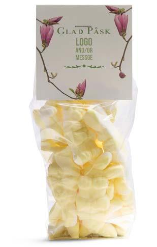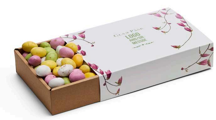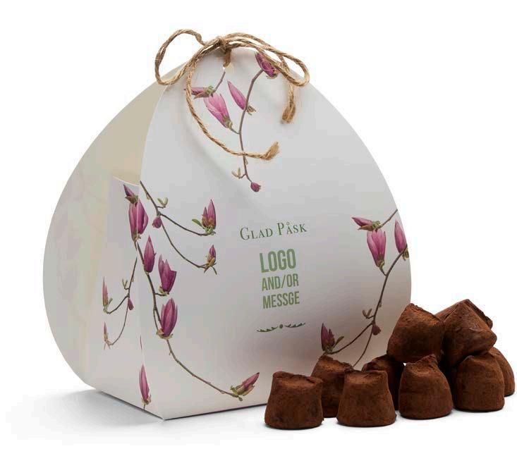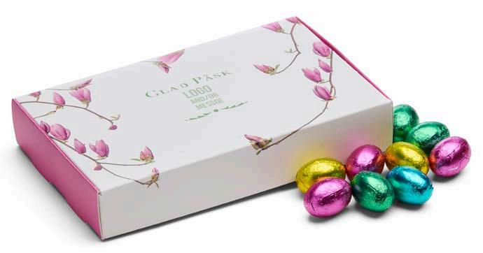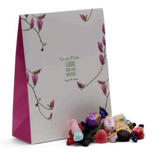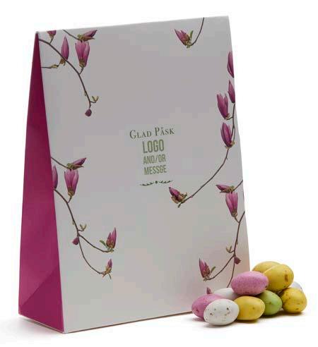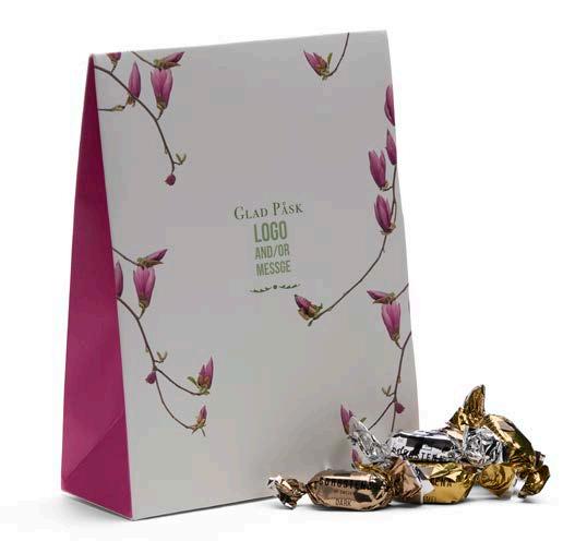 Vi har valgt ut et herlig sortiment for enhver smak. I den anledning tilbyr vi påskefine pakker som vi profilerer etter dine ønsker. Vi har utviklet to fine påskemønstre der vi trykker din hilsen og logo. Selvfølgelig kan du også designe ditt eget påskemotiv hvis du ønsker det.