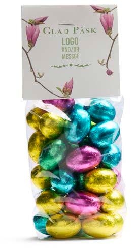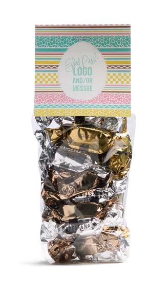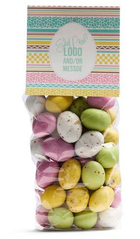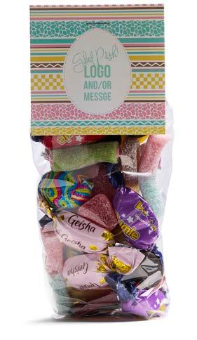Våre gode påskemikser i cellofanpose med dekorativ etikett hvor du kan trykke din egen beskjed.