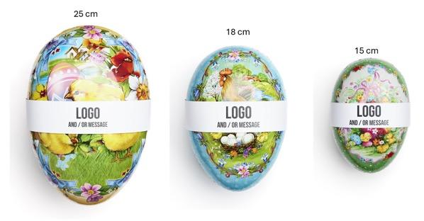 Hva hadde påsken vært uten disse tradisjonelle papireggene! Vi har dem i 5 størrelser. Vi fyller dem med din favorittgodteri og et påskekort eller en sleeve rundt egget, med din personlige hilsen og/eller logo. Velg et av våre påskemotiver eller lag ditt eget. (20 kr kommer i tillegg per påskekort)