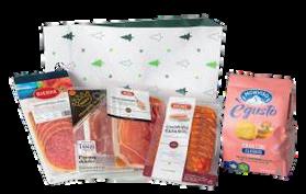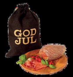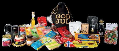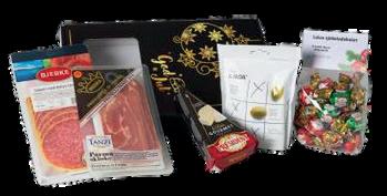 Innhold: Røkt laks skivet 100 g, Kalkunbryst marinert 80 g, Ribberull skivet 100 g, Oliven olje naturell nr 1 100 ml, EvergoodDark Roast filtermalt 250 g, Snack Crackers Salted 100 g, President Gourmet Brie 200 g, Marsipan og sjokoladepose Nidar 130g, Sennep med tryffel 150 g, Bjerke Hummer & Rekesalat 180 g, Bjerke Bøkerøkt skinke 120 g, Babybel i nett 120 g, Rødvinspølse200g, Choco Petit-Beurre 150 g, Serranoskinke skivet 80 g, Julegløgg 0,5 l, Holmsens Brente mandler 100 g, Melkesjokolade 220g, Grillet svinekam 80 g, Laica Italienske sjokoladekuler 250 g, President gourmet smør med havsalt 250 g, Bjerke Aioli 200 g