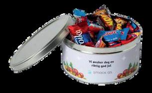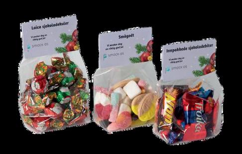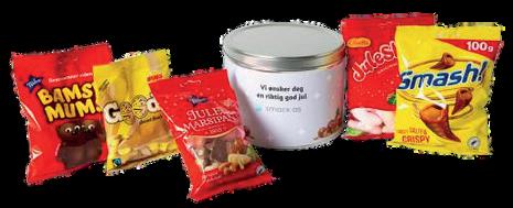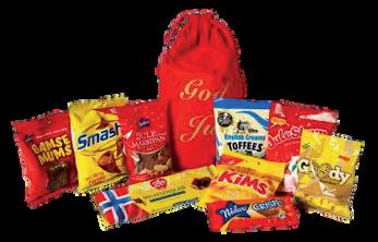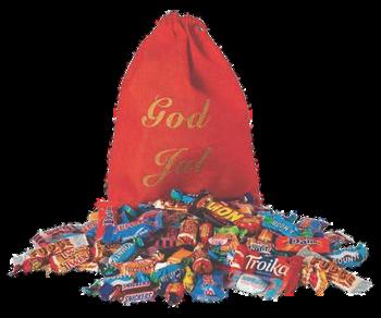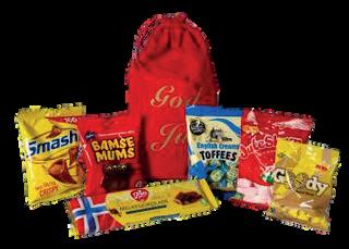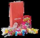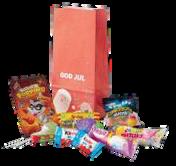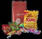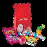 Innhold: Melkesjokolade 220 g, Bamsemums 115 g, Cloetta Juleskum 100 g, Goody 90 g, Walkers 150 g, Smash 100 g, Kims salt crunch 30 g, Crispo plate 65 g, Marsipan og sjokoladepose Nidar 130 g Pakkes i rød striesekk med teksten God Jul