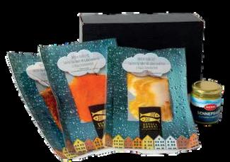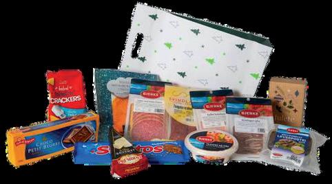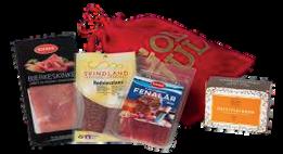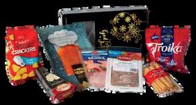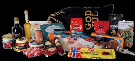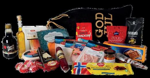 Innhold: Røkt laks skivet 100 g, Kalkunbryst marinert 80 g, Ribberull skivet 100 g, Oliven olje naturell nr 1 100 ml, Evergood Dark Roast filtermalt 250 g, Snack Crackers Salted 100 g, President Gourmet Brie 200 g, Marsipan og sjokoladepose Nidar 130 g, Sennep med tryffel 150 g, Bjerke Hummer & Rekesalat 180 g, Bjerke Bøkerøkt skinke 120 g Babybel i nett 120 g, Rødvinspølse 200 g, Choco Petit-Beurre 150 g