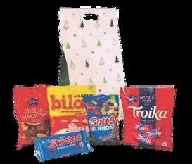 Innhold: Marsipan ogsjokoladepose Nidar 130g,Bilar125g, Troika pose 150 g, Stratos plate 65 g, Gott & Blandat 160 g Pakkes i papirpose med julemotiv og bærehåndtak