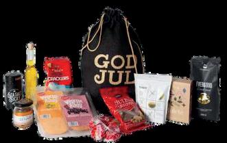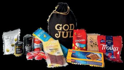 Innhold: Vegalami 90 g, Kvernet pepper skivet pålegg 100 g, Sea Salt 250 g, Oliven olje naturell nr. 1, 100 ml, Evergood Dark Roast filtermalt 250 g, Snack Crackers Salted 100 g, Julete Crema 200 g, Marsipan og sjokoladepose Nidar 130 g, Babybel i nett 120 g, Sennep med Tryffel 150 g, Oliven Iliada grønn uten sten 120 g, Black Pepper Crushed 90 g, Go'Vegan Original Synnøve 200 g, Vegetar Pålegg sprek jalapenjo 80 g, Choco Petit-Beurre 150 g Pakkes i sort striesekk med teksten God Jul