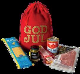 Innhold: De Cecco Spaghetti 500 g, Mutti Finhakkede tomater 400 g, Babybel i nett 120 g, Sea Salt Sicily 250 g , Jacobs Grønn Pesto 130 g, Oliven Iliada grønn uten sten 120g, Julete Crema 200 g, Troika pose 150 g, Choco Petit-Beurre 150 g, Rødvinssalami 100 g, Snack Crackers Salted 100 g Pakkes i sort striesekk med teksten God Jul