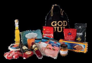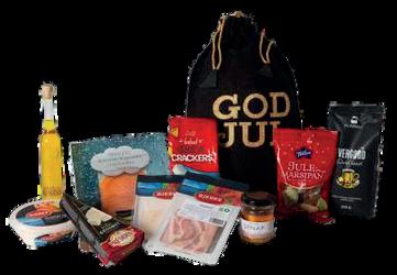 Innhold: Røkt laks skivet 100 g, Kalkunbryst marinert 80 g, Ribberull skivet 100 g, Oliven olje naturell nr 1 100 ml, Evergood Dark Roast filtermalt 250 g, Snack Crackers Salted 100 g, President Gourmet Brie 200 g, Marsipan og sjokoladepose Nidar 130 g, Sennep med tryffel 150 g, Bjerke Hummer & Rekesalat 180 g, Bjerke Bøkerøkt skinke 120 g Babybel i nett 120 g, Rødvinspølse 200 g, Choco Petit-Beurre 150 g, Serranoskinke skivet 80 g, Julegløgg 0,5 l, Holmsens Brente mandler 100 g, Melkesjokolade 220 g, Grillet svinekam 80 g