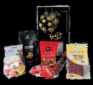 Innhold: Festpølse med Aquavit 200 g, Rødvinssalami 100 g, Babybel i nett 120 g, Marsipan og sjokoladepose Nidar 130 g, Julens smågodt blanding 250 g, Evergood Dark Roast filtermalt 250 g Pakkes i gaveeske med vindu og med teksten God Jul
