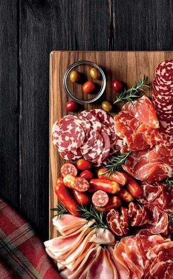 Innhold: Bjerkeskinke 80 g, Rødvinspølse 100 g, Fenalår skivet 70 g, Holmen Crisp Potetflatbrød 210 g