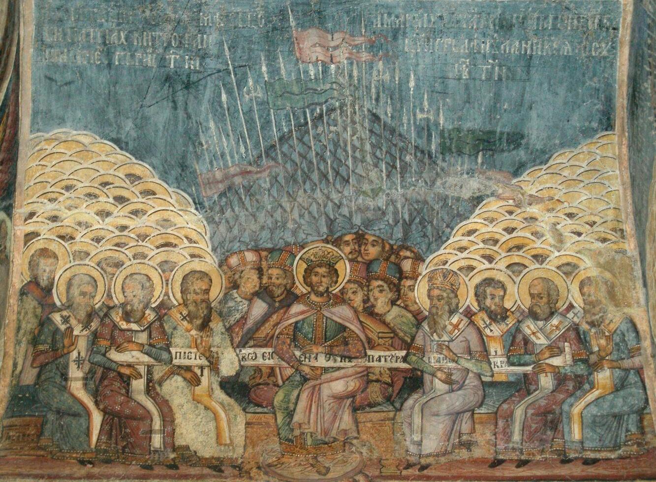 Freske av kirkemøtet i Nikea fra en ortodoks kirke i Bucuresti I sentrum sitter keiser Konstantin (Kilde: Wikimedia Commons)