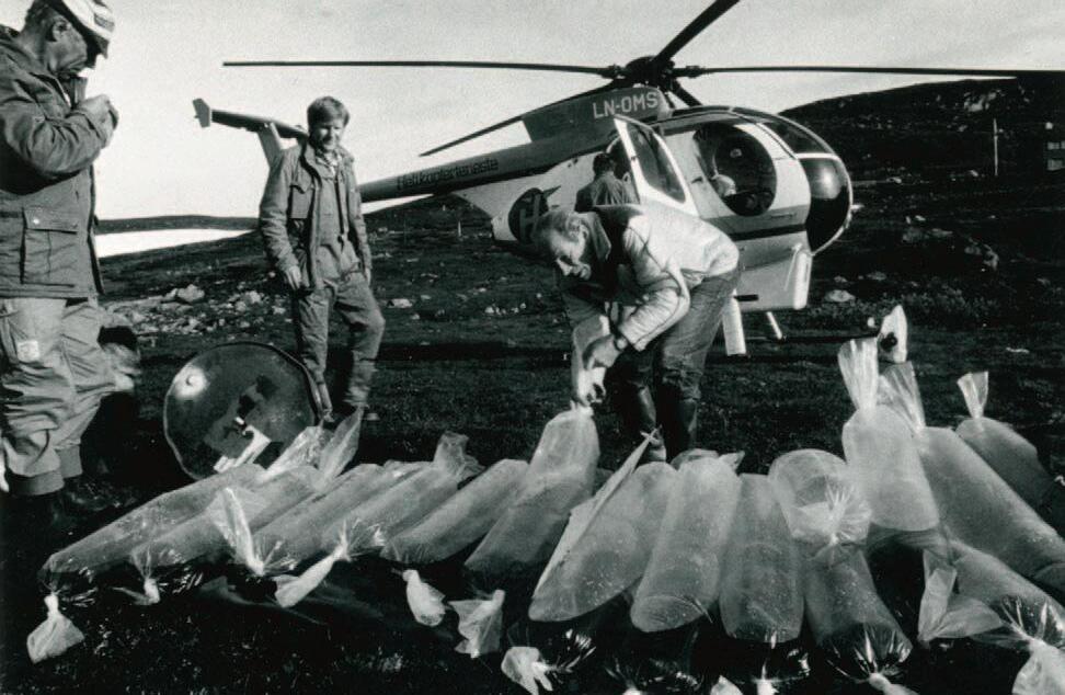 Dei andre to bildene viser utsetting av settefisk i Bjornesfjorden. Bildene er frå Kilebua, dit fisken kom med helikopter og vart spredt vidare rundt i fjorden med fiskebåtana i fjorden.