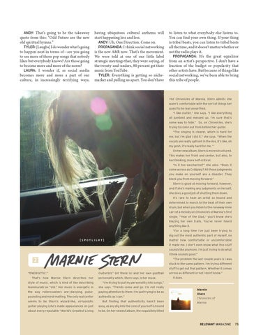 to listen to what everybody else listens to. You can find your own thing. If your thing is tribal beats, you can listen to tribal beats all the time, and it doesn’t matter whether or not the radio plays it. PROPAGANDA: It’s the great equalizer from an artist’s perspective. I don’t have a fraction of the budget or popularity that other artists have. But because of things like social networking, we’ve been able to bring this tribe of people.
