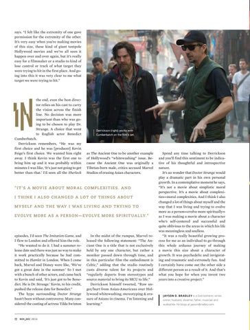 episodes, I’d seen The Imitation Game, and I flew to London and offered him the role. “He wanted to do it. I had a summer release date and there was just no way to make it work practically because he had committed to Hamlet in London. When I came back, Marvel and Disney were like, ‘We’ve got a great date in the summer.’ So I met with a bunch of other actors, and came back to Kevin and said, ‘It’s just got to be Benedict. He is Dr. Strange.’ Kevin, to his credit, pushed the release date for Benedict.” The hype surrounding Doctor Strange hasn’t been without controversy. Many considered the casting of actress Tilda Swinton