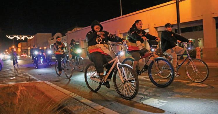 On a wintery evening in the afterglow of Christmas, a group comes together in El Centro just as it does nearly every Friday to light up the night on a leisurely cruise on bikes, many illuminated in bright neon fluorescents.
