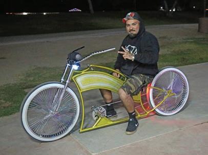 Derrick Hirales of Indio (formerly of Brawley) rides a sustained wheelie as he makes his way down the street and through the park, quite the sight to behold with his wheels aglow in neon lights gleaming in the dark.