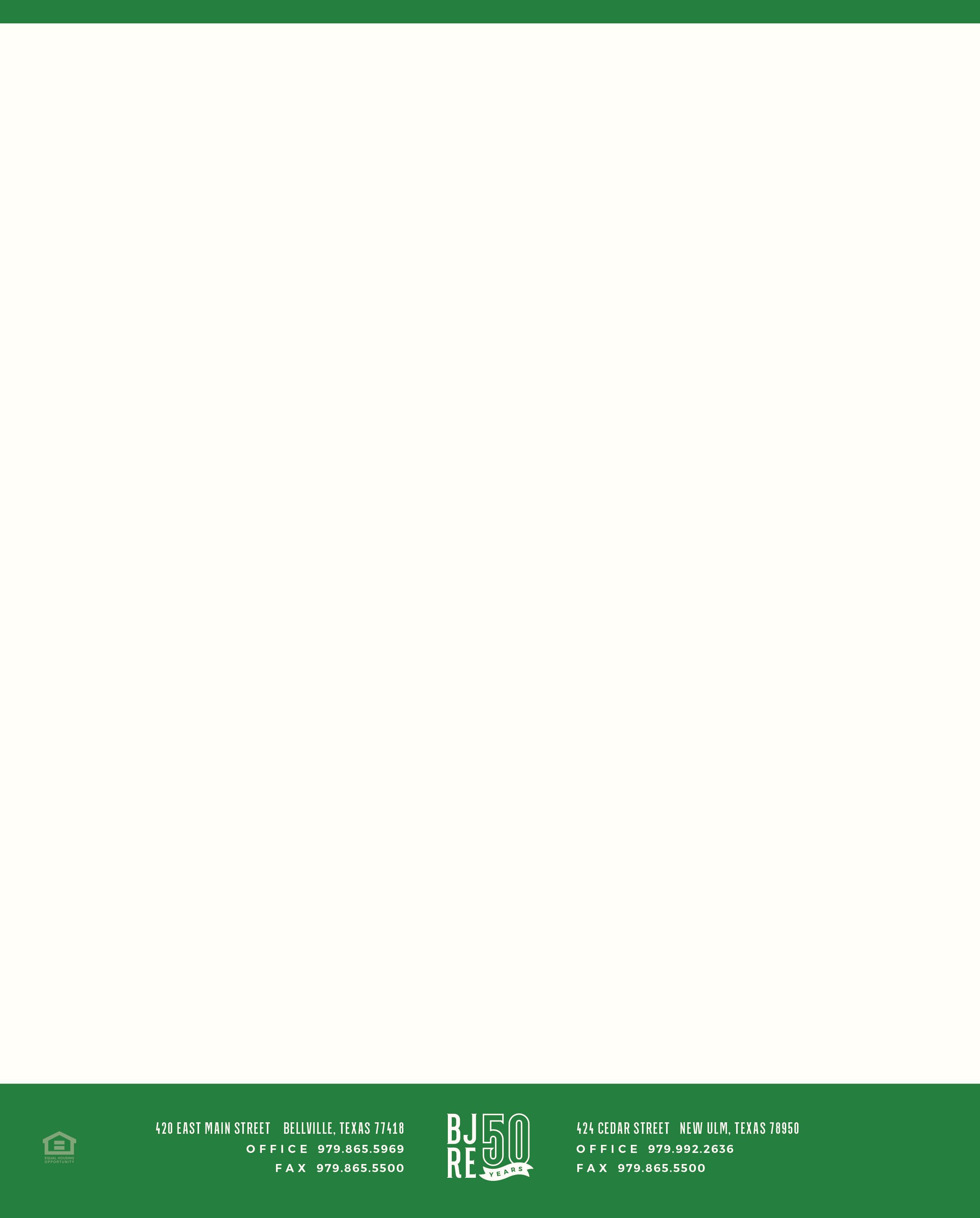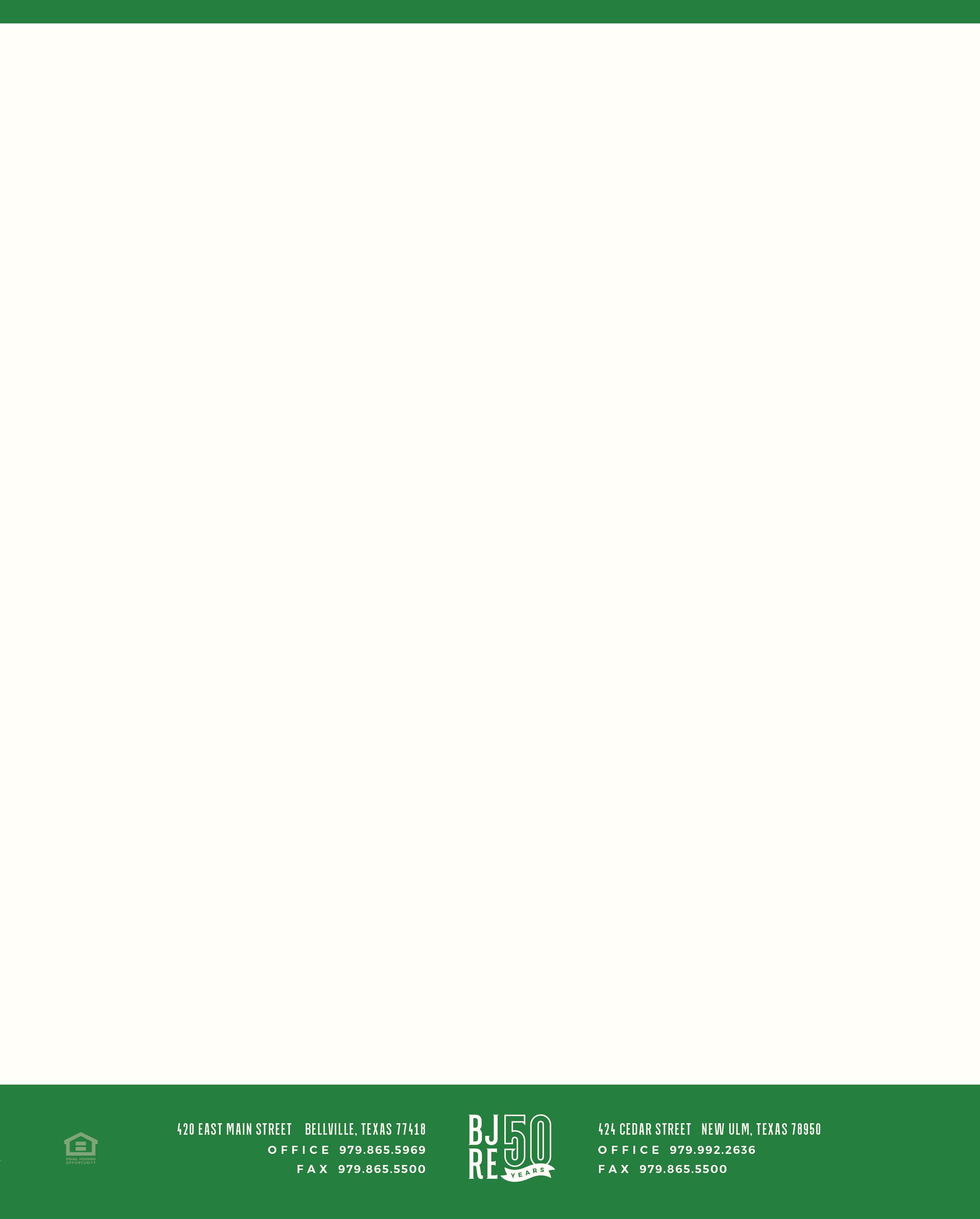 ADVERTISING INFO: 979-249-7584 PEG@CVCTX.COM ~16 6 ac adjacent to Foster's Branch Stocked tank, development potential Northwester city limits boundary 2 sides of road frontage 2 access points from Matula St. T W I N O A K S R A N C H , H A L L E T T S V I L L E C H I P B U B E L A BROKER/OWNER/ALC ~74 25 acres ~5900 square ft of road frontage 3497 square ft home (LCAD) 5 bed/3 bath 1 3 5 4 C R 2 8 1 , S H I N E R 1 2 9 B L U F F S T R E E T , S M I T H V I L L E Our Mission: To help individuals and families live out a legacy through real estate. 979.743.4555 ~220 ACRES ~ 1,171.10 feet of frontage on Rocky Creek In the same family for over 150 years Main House with a pool Guest House Event Space with a commercial kitchen + / - 5 5 0 f e e t o f u n d i s t u r b e d r i v e r f r o n t a g e 2 9 7 4 a c r e s o n t h e C o l o r a d o R i v e r M a t u r e t r e e s & 2 c o n c r e t e p a d s o n p r o p e r t y B O R D E N , C R E E K R A N C H , W E I M A R 4 0 0 a c r e c o m m u n i t y Lot 5: 10.660 acre tract with stocked catfish pond Lot 2: ~12 834 acre tract with private pond, adjacent to a slough L I M I T E D T I M E P R I C I N G R A R E F I N D 2 2 9 L L O Y D L A N E , S C H U L E N B U R G www.bubelarealestate.com S H I N E R R A N C H