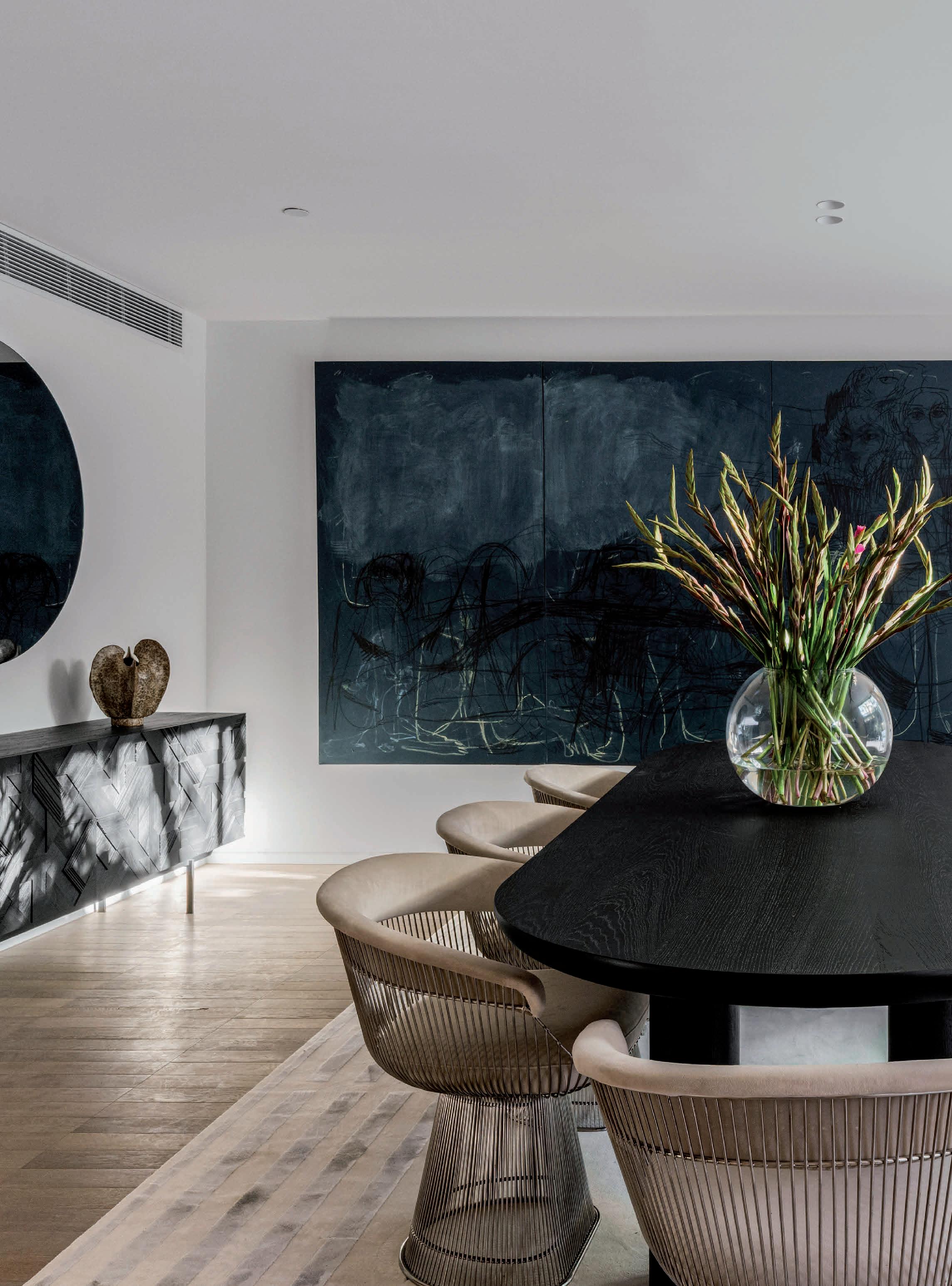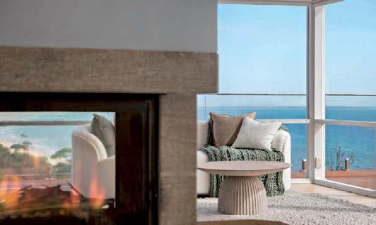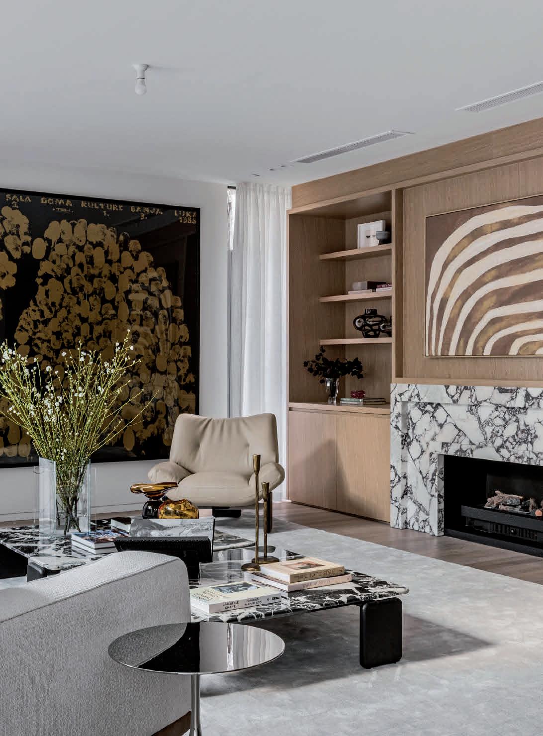 Pale oak floors, soaring ceilings, and exquisite finishes create a warm, inviting ambiance. The expansive entrance gallery flows into a generous living area, highlighted by a marble gas log fire and elegant oak cabinetry that connects seamlessly to the dining space. Floor-to-ceiling glass doors open to a west-facing courtyard with two covered dining areas, a built-in BBQ, and lush gardens, perfect for entertaining.