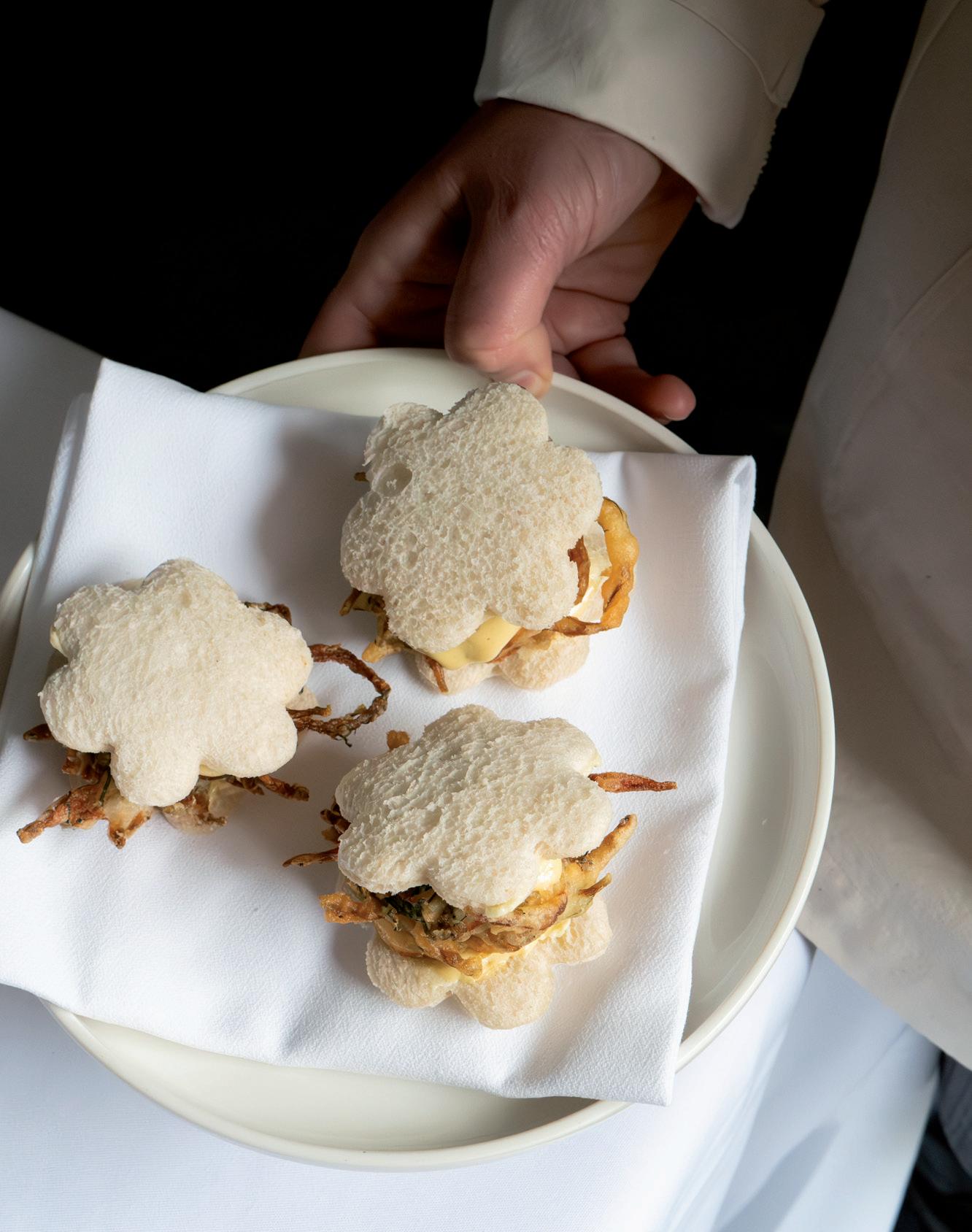 6. Place a whitebait fritter on top, season lightly with salt, then sandwich with the remaining bread rounds.