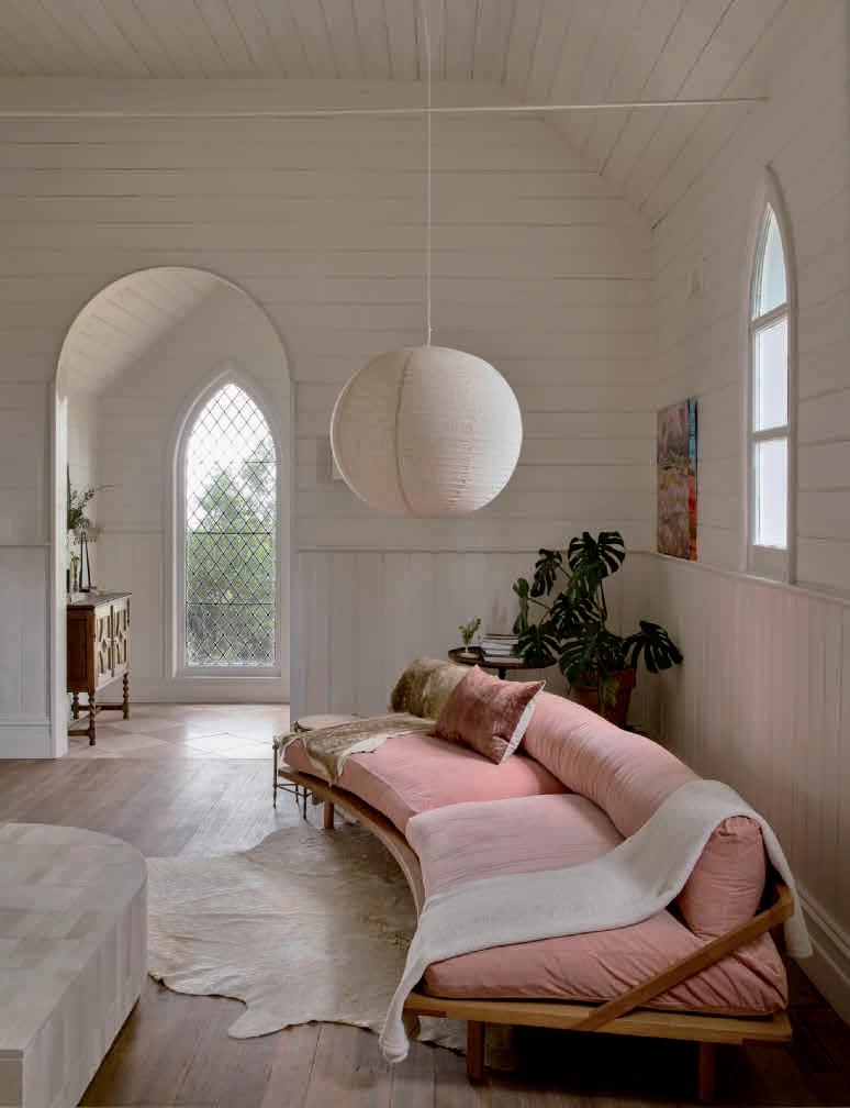 At the heart of the home, the original chapel forms a striking openplan living space. A custom Pop & Scott sofa, dining area, fully equipped kitchen with stone benchtops and a sculptural 360-degree rotating fireplace create a warm, inviting atmosphere. Gothic arched windows frame soft glimpses of the surrounding landscape, while French doors open onto a deck and brick fire pit, immersed among towering pine and cypress trees.