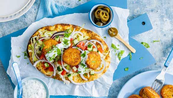 Bland sammen yoghurt, presset hvitløk, sukker, sitronsaft og hakket bladpersille. Smak til med salt og pepper. Sett dressingen kjølig. Varm falafel i stekepannen, eller i ovnen på 200 grader i 5-7 min. Skjær salat og løk i strimler. Del tomater i to og skjær ut kjernene. Skjær tomater og agurk i terninger. Varm naan i ovnen som anvist på pakken. Legg en liten neve strimlet salat, løk og tomat- og agurkterninger på hvert naan. Legg 2-3 stk. falafel på til slutt og topp med dressing.