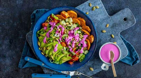 Sett ovnen på 210 grader, varmluft. Skrell søtpoteten og skjær den i 1 cm. tykke skiver. Pensle med olje og legg utover et stekebrett med bakepapir. Salte lett. Sett midt i ovnen i ca. 25 min. til potetskivene er møre og gylne. Strø gresskarfrø utover et brett og sett i ovnen de siste 5 min. til de er gylne. Skjær avokado i to og så i skiver. Skjær agurk og tomat i små terninger, og vårløk i tynne strimler. Lag dressing ved å bryte opp biter av feta ost i en beholder. Tilsett biter av rødbete, presset hvitløk, yoghurt og sitronsaft. Kjør glatt med stavmikser eller i blender. Smak til med salt og pepper. Legg skiver av søtpotet i en dyp tallerken eller skål. Legg agurk og tomater i striper på toppen. Legg på en vifte med avokado. Strø over ristede gresskarfrø og vårløk. Server med fetaost-dressing.