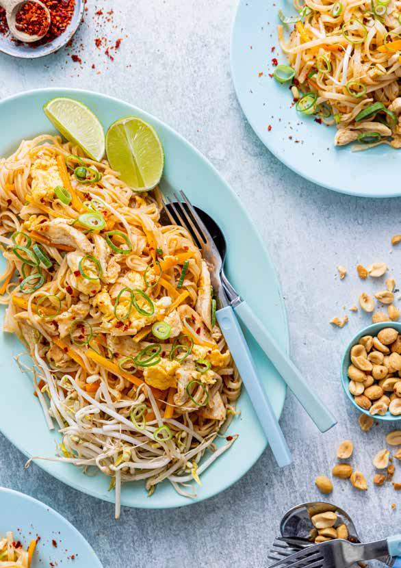 Ha oppi 1 ss olje på den tomme siden. Tilsett sammenpiskede egg på den tomme siden. La steke i 2-3 min. mens du skyver frem og tilbake. Når eggene er blitt faste, blandes de sammen med nudlene. Ha til slutt oppi bønnespirer. Dryss over med hakket vårløk og server med peanøtter, lime – og gjerne litt chili flakes om ønskelig.