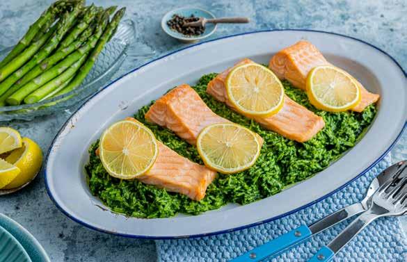 Kok ris som anvist på pakken. Ha fløte og spinat i en blender/stav mikser og kjør til en saus. Salte og pepre godt. Vend sausen inn i risen. Sett ovnen på 200 grader, varmluft. Ha risen over i en ildfast form. Legg laksestykkene på toppen. Salte lett. Skjær sitronen i tynne skiver og legg rundt i formen. Sett midt i ovnen i ca. 12 min. eller til laksen er ferdig. Knekk av den trevlete delen nederst på aspargesene. Damp eller kok til de er møre. Server asparges på toppen av lakseretten.